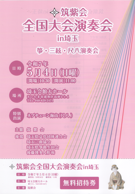 ご案内です。来る5月4日埼玉会館にて筑紫会全国大会が行われます。浦和駅から徒歩6分の埼玉会館大ホールで行われます。お家元の筑紫順子先生もいらっしゃいます。私は、6曲目銀河の幻想を演奏いたします、親先生含め、大先生方も気合が入っております。たくさんのご来場ありがとうございました。